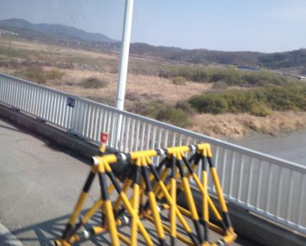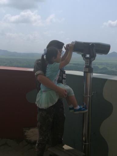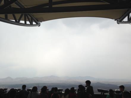 從地道出來我們被運到了都羅展望台,這裏的風景主要在展望台外部,那裏有一個寬敞的觀景台,遊客可以投幣500韓元后,通過望遠鏡來觀察對面的朝鮮村落和前面提到的世界上最高的旗杆以及開城工業區。我眯着眼睛,看到對面有人在走動,突然有了一種參觀動物園的感覺。區別就是不能隨意拍照,地上畫有禁拍線,線內不能拍。我只好舉起手機亂拍了兩張(對面即是朝鮮)。