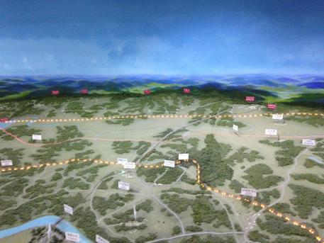 每個來DMZ的人都要先到放映廳看一部二十分鐘不到的影片。每個人會發一個無線耳機,裏面有多達十幾種語言的同聲傳譯,韓國可不會輕易放棄這個教育世界人民的機會。影片主要講述了二戰後半島如何期盼和平,但朝鮮卻悍然撕毀協定進攻南韓,連年的戰爭造成了大量家庭親屬分隔兩地,給人民帶來的巨大傷害。總結一下就是:朝鮮臭流氓!我們的口號是:世界和平!影片最後特地描述了現在DMZ的美好。是的,因為這個寬達4公里的區域嚴禁人類出現,反而成了野生動物的天堂。頗為反諷。(下圖燈帶內即所謂的無人區)