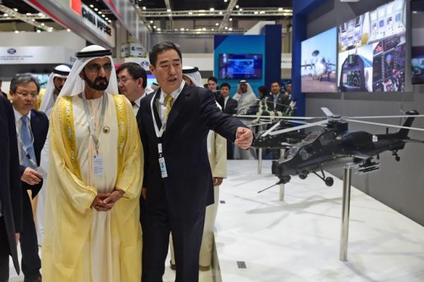 阿聯酋首都阿布扎比,阿聯酋副總統兼總理、迪拜酋長穆罕默德·本·拉希德·阿勒馬克圖姆(前左)參觀中國防務展區