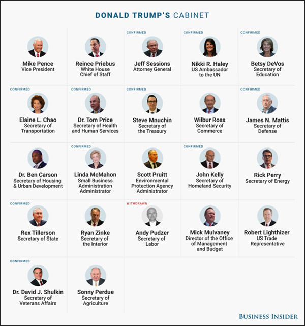 值得一提的是,在特朗普內閣中僅有的一名獲全票通過的部長是退休軍人事務部部長大衞·舒爾金,但同時此人也是特朗普提名內閣中唯一在奧巴馬政府中任職過的人員。
