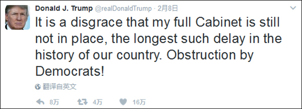 2月8日,特朗普在社交網站上發文抱怨稱:“我的內閣成員還沒有全部到位,這是美國歷史上拖延時間最長的一次,真是恥辱。民主黨設置障礙!”