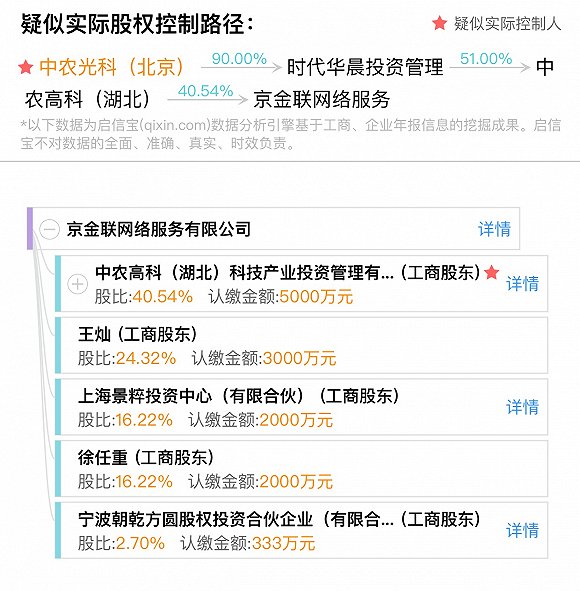 京金聯的工商資料顯示,在京金聯的股權構成中,中農高科持股比例達到了40.54%,而其創始人王燦的持股比例僅為24.32%。京金聯註冊成立於2014年6月5日,總部位於湖北武漢,註冊資金為1.2333億元。京金聯平台一向對外宣稱,“公司由中農基金控股單位——中農高科(湖北)科技產業投資管理有限公司發起,並持有京金聯60%的股份,總部位於中國武漢,屬於國資背景”。