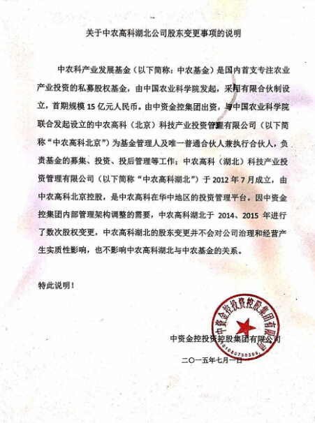 界面新聞記者掌握的一份名為中農高科湖北公司股東變更事項説明的文件中顯示,“中農基金是由中國農業科學院發起採用有限合夥制設立的國內首支專注農業產業投資的私募股權基金”,而“中農高科(北京)科技產業投資管理有限公司(下稱中農高科)為中農科產業發展基金管理人及唯一普通合夥人兼執行合夥人,負責基金的募集、投資、投後管理等工作”。