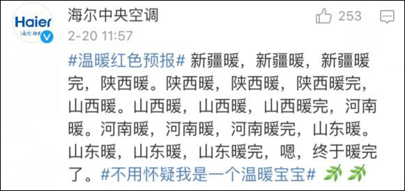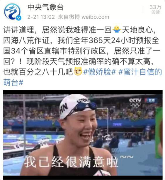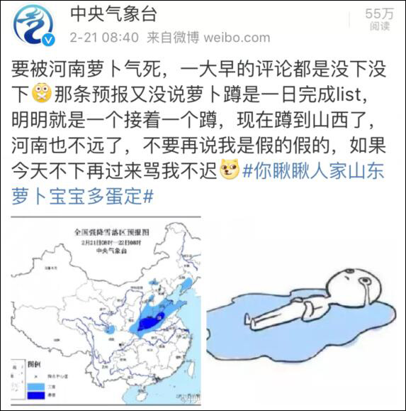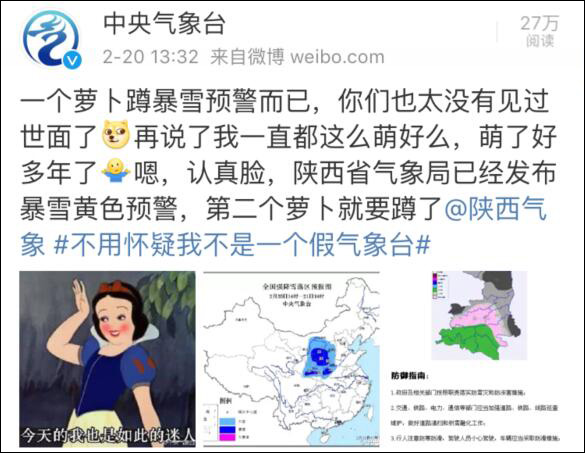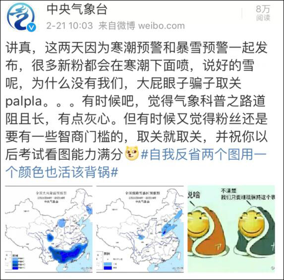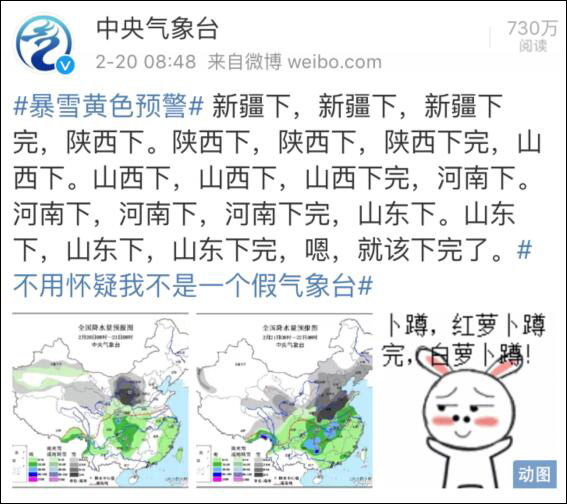 2月20日上午,中央氣象台官微很“不正經”的發佈了一條微博。