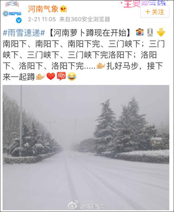 事實證明,中央氣象台的預報還是很準的,沒過多久,河南就開始下雪了,然後又開始了蘿蔔蹲遊戲。