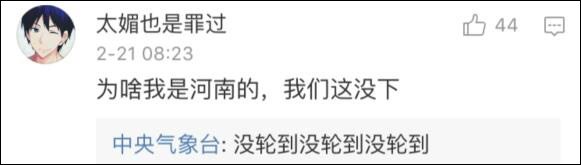 河南網友表示,氣象台不靠譜,雪呢雪呢,根本沒見着。