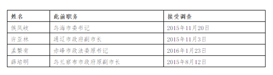 4人集中在2015年下半年到2016年初落馬,算起來,從落馬到被開除黨籍,大概用了一年出頭的時間。就案件的查辦進度來看,薛培明較快,2016年12月13日,在其落馬4個月後,內蒙古自治區興安盟檢察分院就薛培明涉嫌受賄罪、利用影響力受賄罪,向興安盟中級人民法院提起公訴。這也讓薛培明先被公訴後被開除黨籍,與一般官員有別。