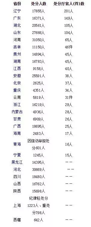 就在2月上旬,人民網梳理目前遼寧等27個省份公佈的2016年黨紀政紀處分情況,不完全統計發現,2016年上述各省份總計約1090餘名地廳級幹部被處分。其中遼寧201名地廳級幹部受處分,在已披露數據省份中居首,其次是廣東,處分了149名地廳級幹部。去年廳官受處分人數超過100人的省份還有湖北和山東。