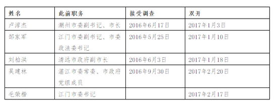 順便再看一下今年以來落馬官員“雙開”比較密集的廣東省,2017年至今不到3個月,該省被“雙開”的官員達5名,且從時間上來看,從接受調查到被“雙開”,5名官員大概都用了小半年的時間。