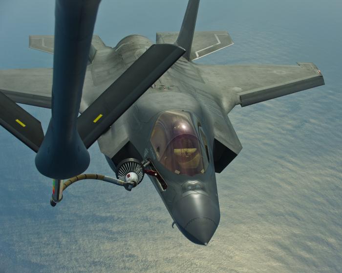 美國空軍的F-35A的最大機內燃油量比F-35B多5175磅,達到18500磅,航程也達到2200公里。越洋飛行的話,基本上每30-40分鐘就要空中加油一次。F-35B的機內燃油量少,航程縮短,空中加油間隔就更短了。但在戰爭時期,美國空軍的條令也會放寬,典型的6小時飛行只需要2-3次空中加油,折算到尤瑪-巖國航線,大約需要5-8次。戰鬥出航的情況又不一樣,要在進入戰鬥前加滿油,加油機無法在戰鬥空域內運作,太危險了,只能等戰鬥機撤出戰鬥空域才能空中加油,然後或者再次投入戰鬥,或者返航。