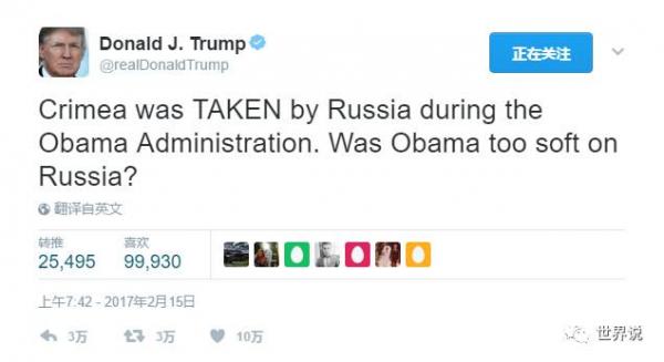 特朗普在Twitter上表態,克里米亞是在奧巴馬任期內被俄羅斯“強奪”的
