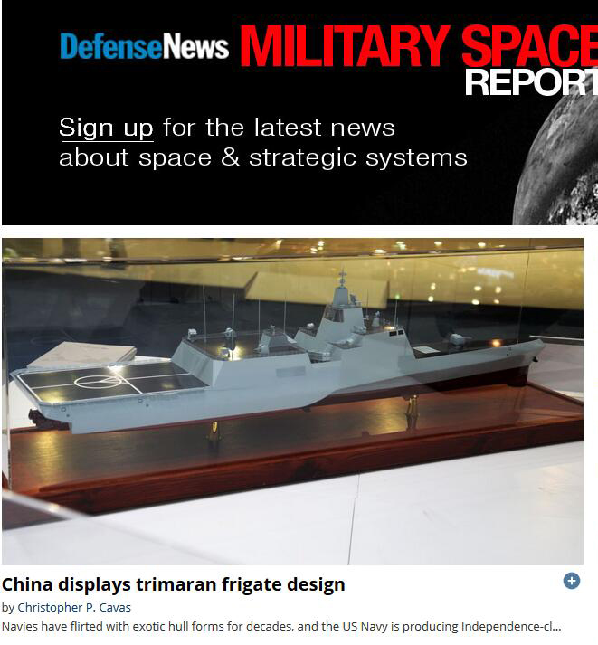 《防務新聞》的海軍版面頗為羨慕嫉妒恨的掛上了中國展台三體護衞艦模型的照片