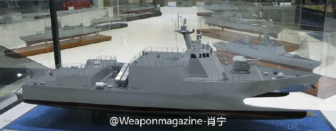 同時中國船舶工業集團還展出了一款700噸級的雙體快速攻擊艦,裝備1門76炮和4部反艦導彈發射器,經在場的中船公司人員介紹,該型號可能是在中國海軍的內部型號競標過程中的落選方案。這也符合中國軍工的外貿傳統。
