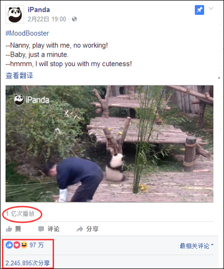 這段神奇的視頻,前天(22日)發佈在iPanda的Facebook主頁上,僅僅兩天,就有97萬次點贊,224萬餘次分享,播放量更是高達1億次!