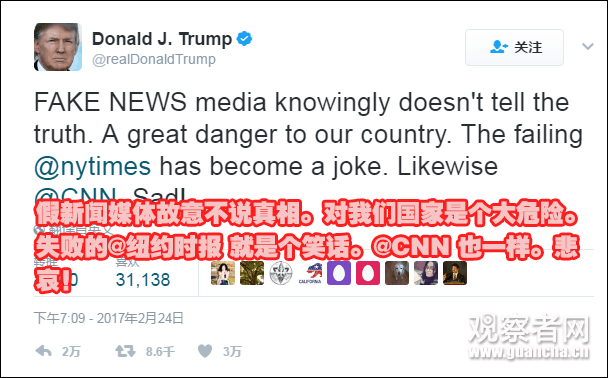 (25日12:50更新)當地時間24日晚,特朗普再次發推攻擊媒體: