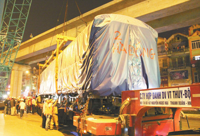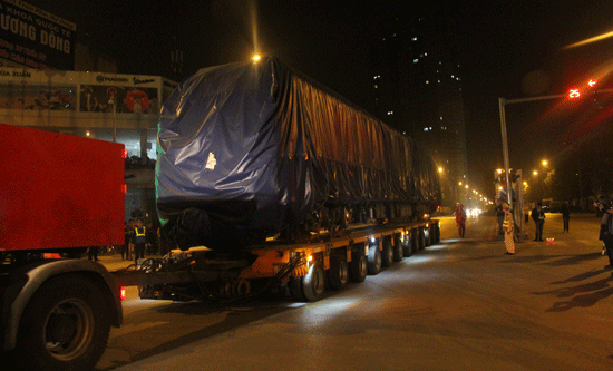 22日晚,越南首都河內市河東郡光中大道車流如織,其餘3輛車廂的吊裝工作開始,依舊吸引了不少當地民眾。一輛48輪加長卡車緩緩駛入作業區,其上運載的機車長約19米、寬2.8米、高3.8米,重達30多噸。在技術人員的準確指揮下,大型起重機將吊鈎降至機車上方,工作人員從多點位對機車進行捆綁。吊裝時,由於周圍民宅密集,作業面有限,懸在空中的機車距離路邊民宅最近時只有一兩米,這讓現場圍觀民眾幾度屏住呼吸。約半小時後,吊鈎下降就位,一顆顆懸着的心終於平復,四周響起熱烈的掌聲。