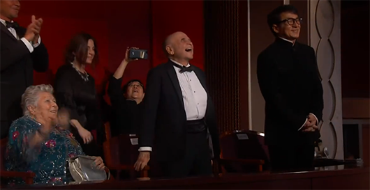 與安妮·考特斯、林恩·斯塔馬斯特兩位老戲骨站在一起,成龍表現得很謙卑,笑着接受全場起立鼓掌。