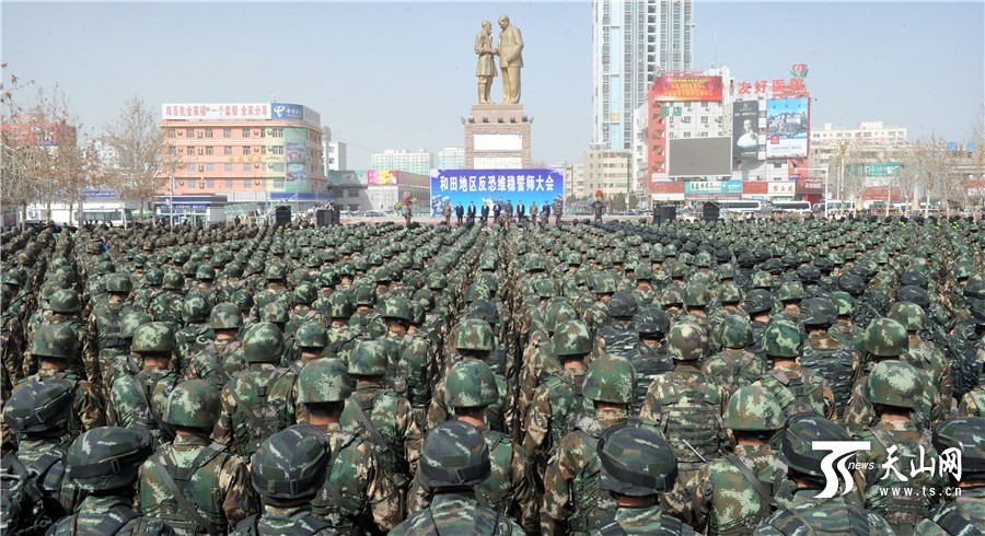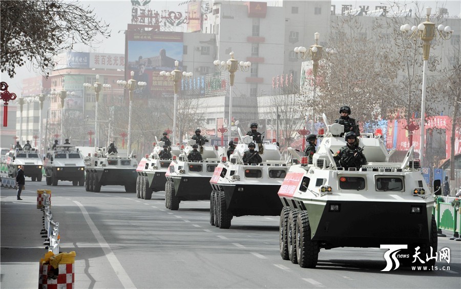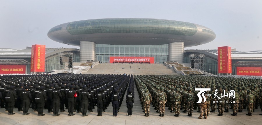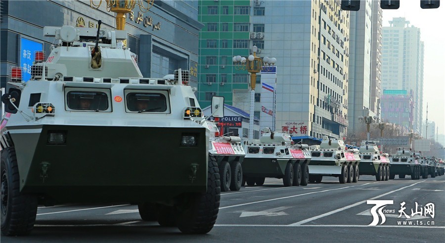 新疆國際會展中心廣場上,1萬餘名武警官兵、公安幹警、民兵預備役人員等各維穩力量緊握鋼槍盾牌、整齊列隊挺立,直升機在空中盤旋,一輛輛軍車、裝甲車、摩托車列隊待發。