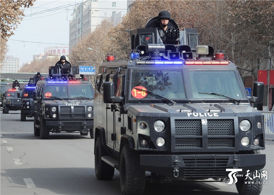 隨着一聲令下,戰士們登上戰車,警燈閃爍,警笛齊鳴,氣勢磅礴。一支威武之師、鋼鐵之師、正義之師吹響衝鋒號,在烏魯木齊市主要街道和重點部位進行武裝巡邏。當天下午,喀什地區、阿克蘇地區、和田地區分別舉行反恐維穩誓師大會。當地武警官兵、公安幹警、民兵預備役人員和自治區赴當地執行反恐維穩任務的武警官兵參加了大會。
