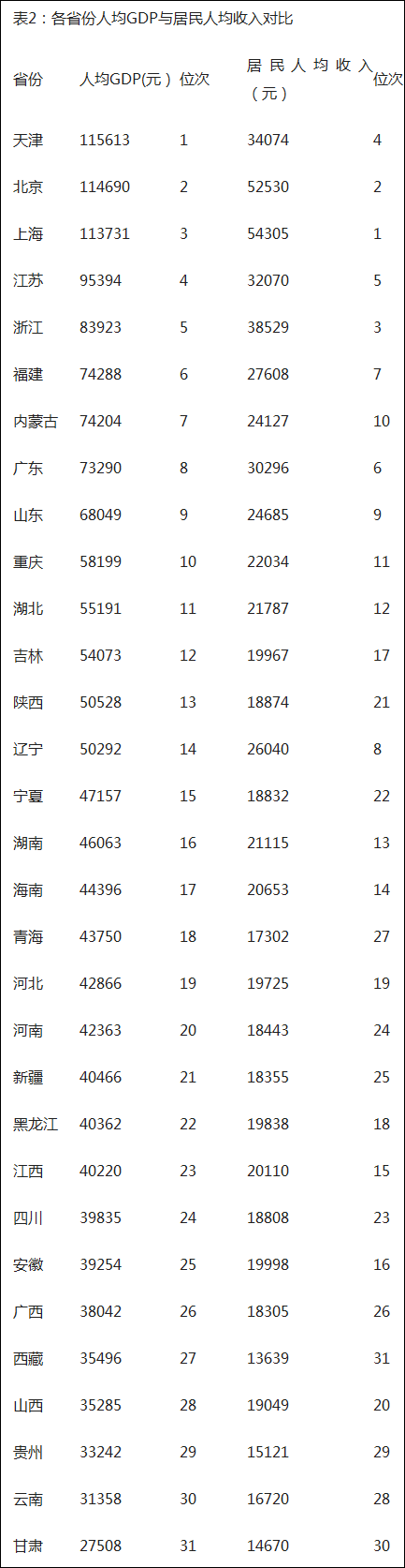 例如,儘管天津的人均GDP高居榜首,但其居民人均收入僅為34074元,與上海、北京均存在較大差距,甚至排在農業人口還佔比不小的浙江後面,僅位居全國第四;而內蒙古的人均GDP超過廣東,高居全國第7,但其居民人均收入僅位居全國第10,比廣東少了約6000元。