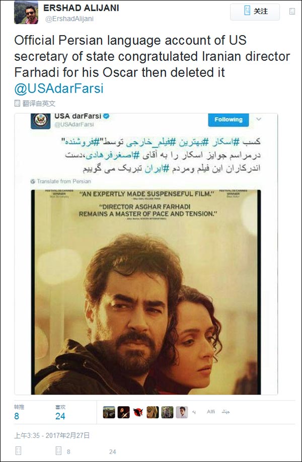 【編譯/觀察者網 周遠方】路透社2月27日報道,美國國務院當日發佈推特,祝賀伊朗導演阿斯哈•法哈蒂(Asghar Farhadi)憑藉“推銷員”一片獲得奧斯卡最佳外語片獎,但隨後將這一推特秒刪。