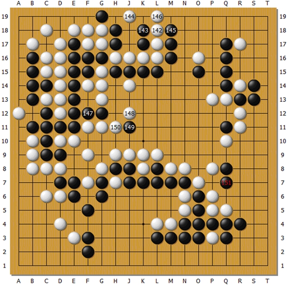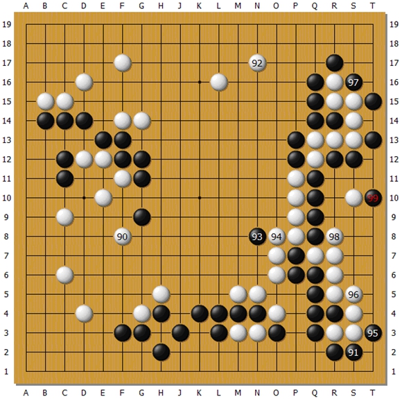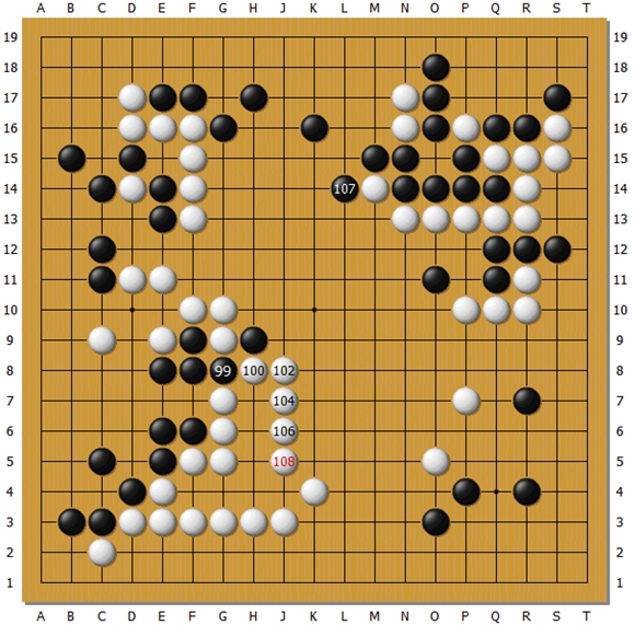 之前認為孟泰齡在Master打吃不應後提吃Master七子,局勢可能領先。如上圖所示,黑99衝白100擋之後,白的102、104、106三子都還在棋盤上,黑下的101、103、105卻沒有出現在棋盤上,因為被108這手全提掉了。與黑第101手直接下107相比,白相當於108一手就同時下了102、104、106、108四個子到棋盤上,Master的虧損一望可知。但是Master的人肉機械臂Aja Huang發貼説這是他擺錯了一招棋,電腦107這手是想在F7提吃白四子的,這樣仍然是黑棋優勢。雖然黑方擺錯棋,但孟泰齡時間緊張後面錯得更厲害,還是輸了。