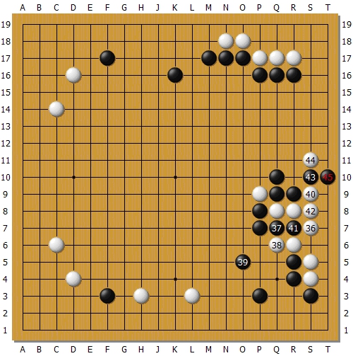 過過50多手的追殺,絕藝才確定大龍死掉的結局,上面中間黑白是雙活。但是時越在前面點眼的時候,就已經對殺棋有把握了。至少不會明顯漏算,發動追殺是時機比較成熟時才會做。而絕藝卻明顯對這類局勢判斷不清楚。