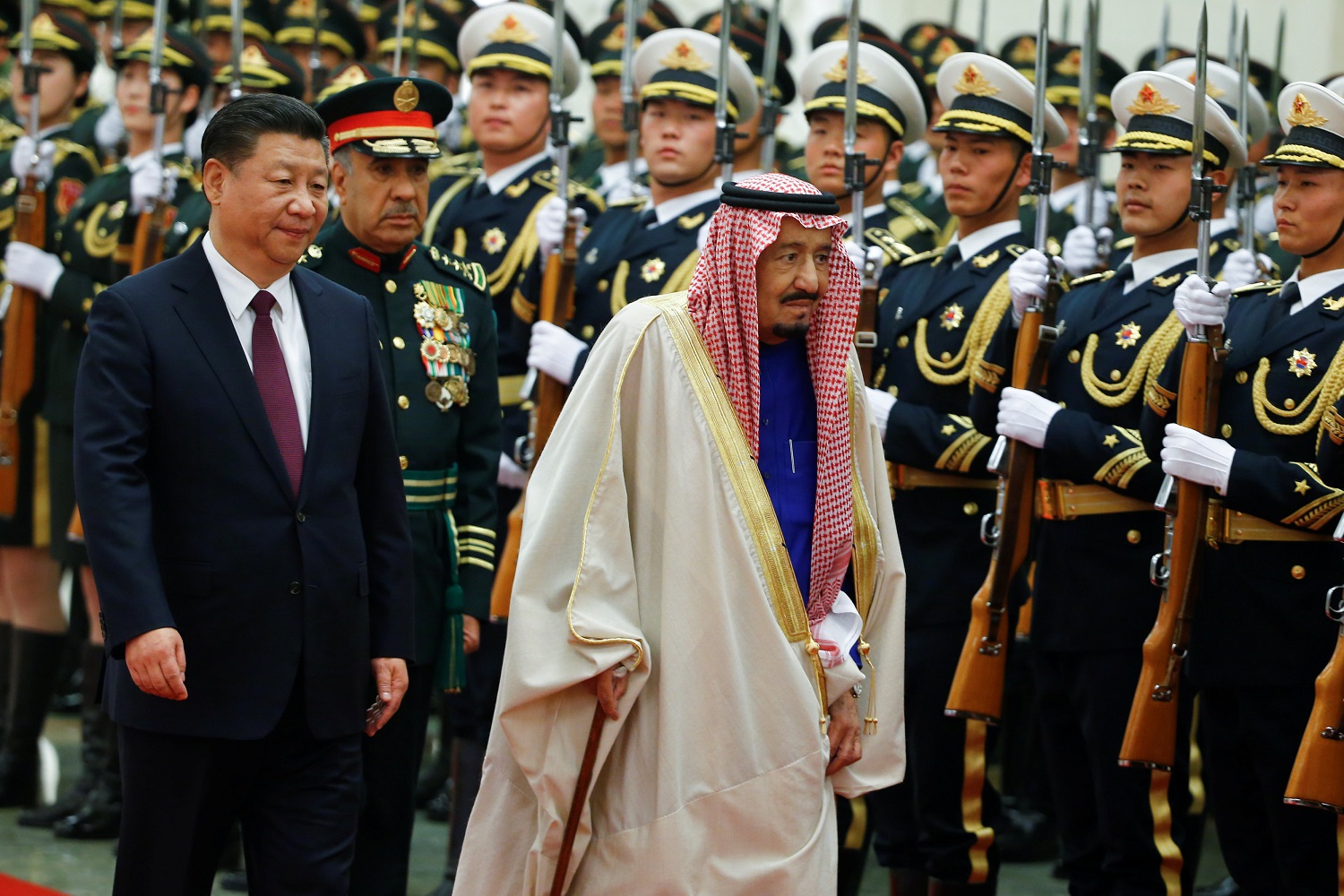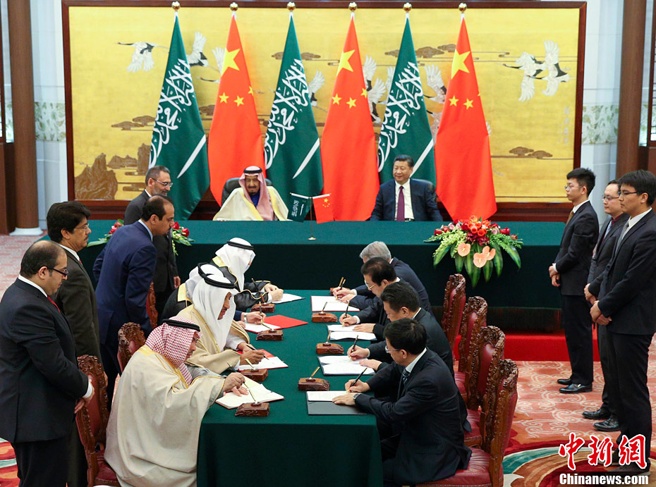 3月16日,中國國家主席習近平在北京人民大會堂同沙特阿拉伯王國國王薩勒曼舉行會談。會談後,兩國元首見證了經貿、能源、產能、文化、教育、科技等領域雙邊合作文件的簽署。