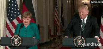 但默克爾在聽到這番言論時卻並沒有露出愉快的表情,而是轉頭嚴肅地看着特朗普。可能在東德長大的她對於這番話有不同的感受。