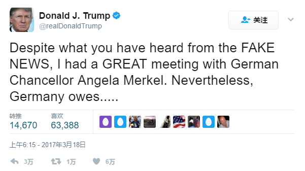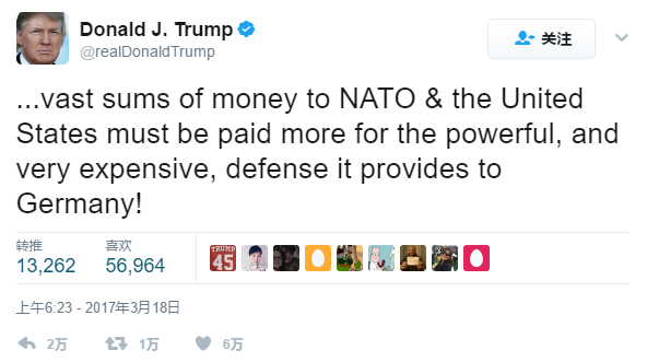簡單來説就是,當地時間3月18日,特朗普在自己推特上連發兩個帖子稱,“不管你從那些假新聞中聽到了什麼,反正我和德國總理默克爾有一次非~~~常愉快的會晤。不過,德國還是欠北約和美國一筆鉅款,我們必須得到更多支付,因為給德國提供了非常昂貴的國防保護。”