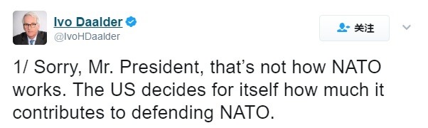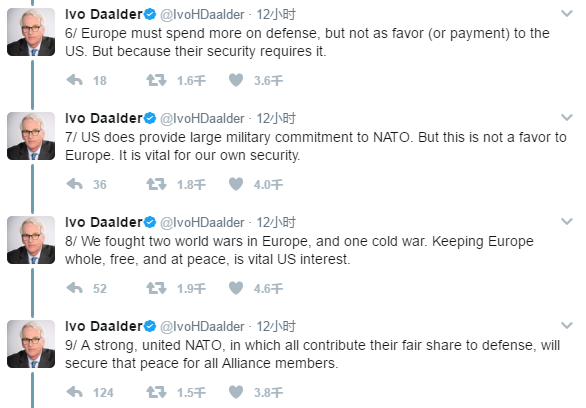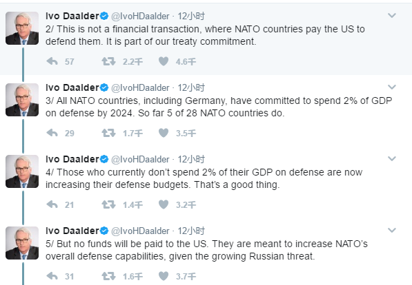 美國前駐北約大使Ivo Daalder連發9條推特解釋何為國防開支、何為北約“會費”: