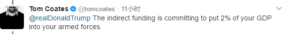 “第四,那些現在沒有使用GDP2%經費的國家正在增加他們的國防預算。這是好事。