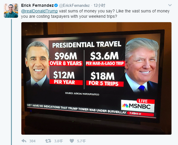 圖片比較特朗普和奧巴馬任期內的旅行花銷,奧巴馬8年內用花費9600萬美元的旅行支出,而特朗普每次去他位於佛羅里達州別墅的行程是360萬美元,上任2個月共5次,花費1800萬美元。