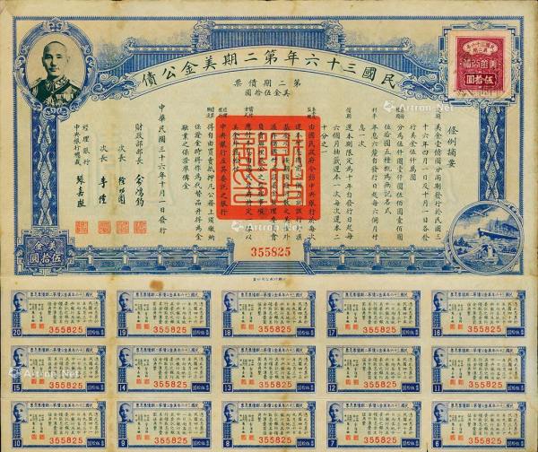 在1947年四月一日發行10年期國債的同時,國民政府還發行了年息為20%的三年期短期國庫券,預定發行量3億實際發行4200多萬美元,現在拍賣網上可以找到面值最高為5000美元。