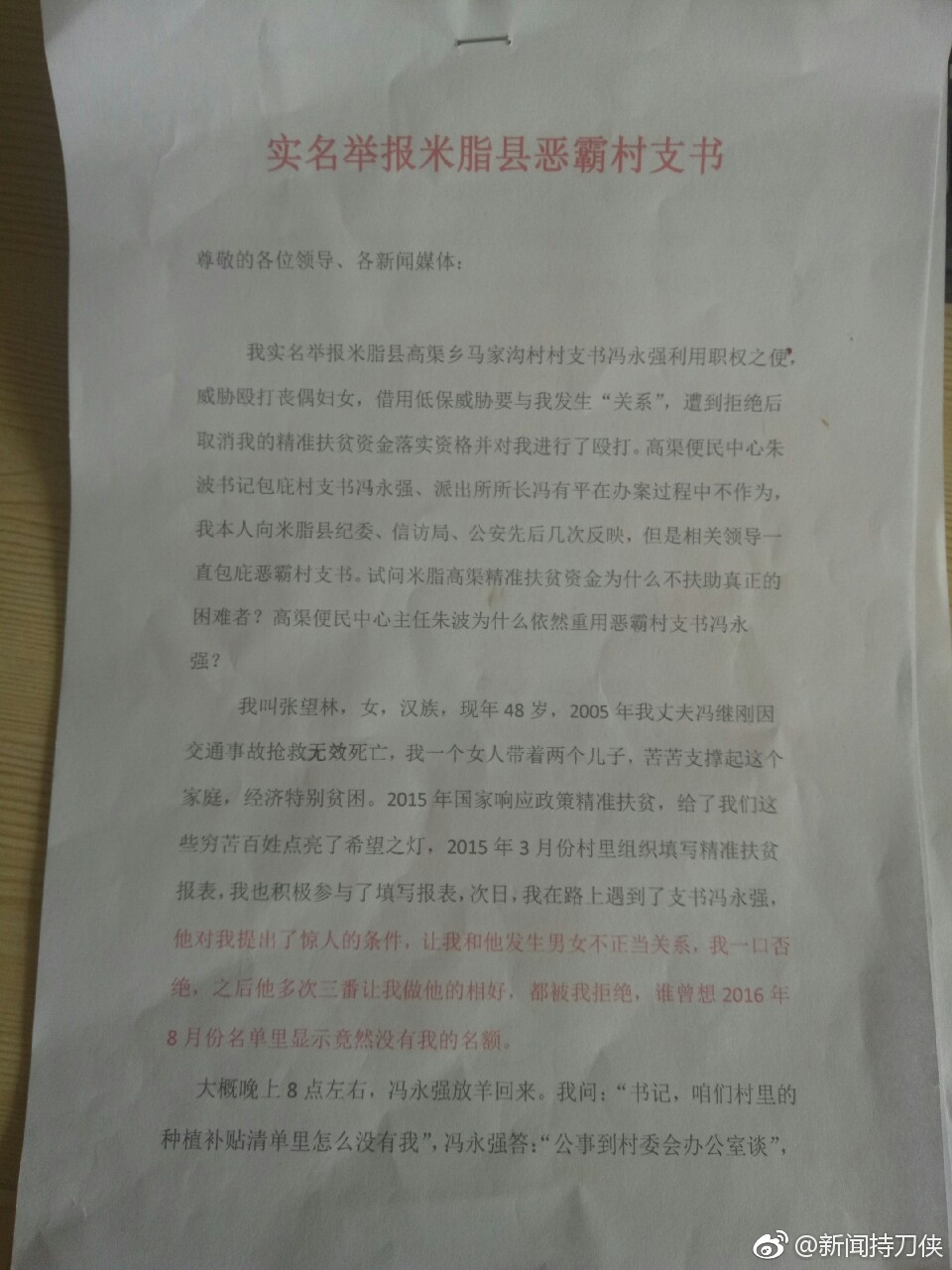 據新京報報道,該舉報視頻中(目前該視頻已被刪除),一女子手持舉報書,稱米脂縣高渠鄉馬家溝村村支書馮某,“利用職權之便,威脅毆打喪偶婦女,要與我發生關係,遭到拒絕後,取消我的精準扶貧資金,並對我進行毆打”。