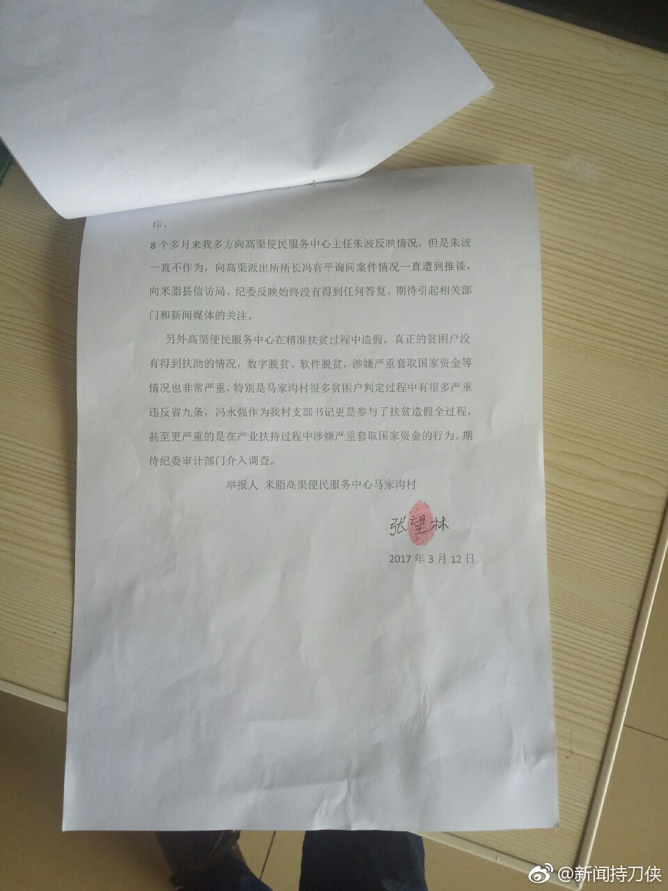 張某後向多方反映,但始終沒有得到答覆。此外,材料中還提及高渠便民服務中心在精準扶貧過程中造假等。