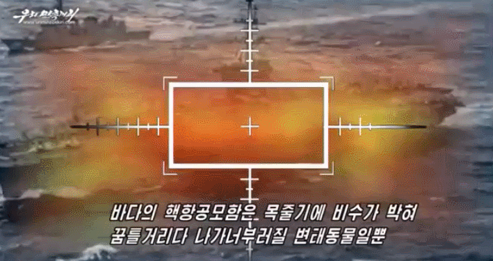 這段視頻由朝鮮YouTube官方賬號“我們民族之間”(uriminzokkiri)發佈,包含擊毀美國航空母艦和戰略轟炸機的片段。