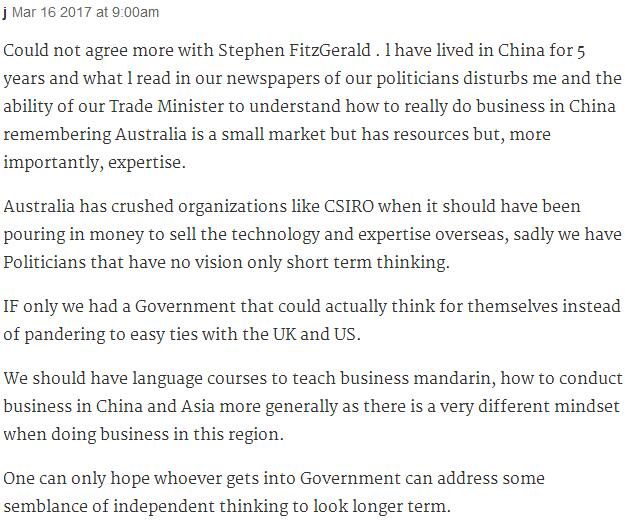 太贊同作者的觀點了!我已經在中國生活5年,我在澳大利亞報紙上讀到的政客們的言論的確讓我感到無奈,我們的貿易部長在如何與中國做生意方面也十分無知。要知道,我們澳大利亞市場不大,但我們有豐富的資源,而且更重要的是,我們有專業技能。