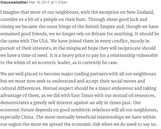我們跟美國的關係與此類似。我們參加了美國人的每一場戰爭,其實大多都是為了他們的利益,而我們還不切實際地盼着在我們有需要的時候,美國人能對我們有所回報。維護與美國之間的關係代價太高了,就象現在的情形,澳美關係輕易就被這個剛上台的古怪總統毀掉了。