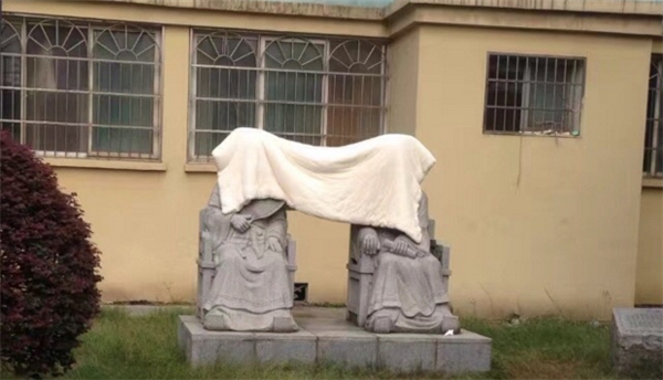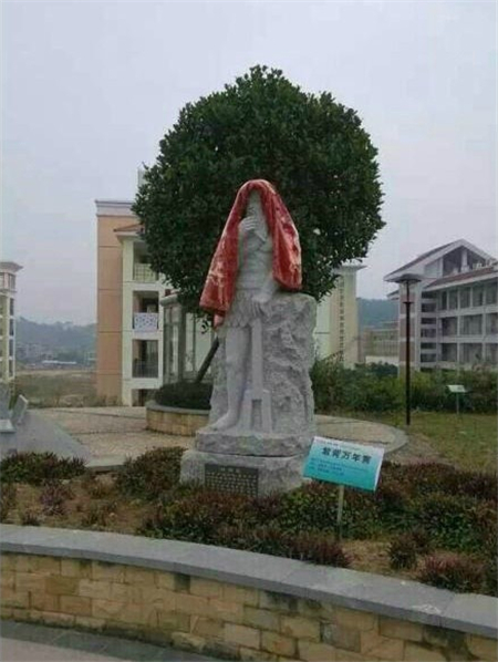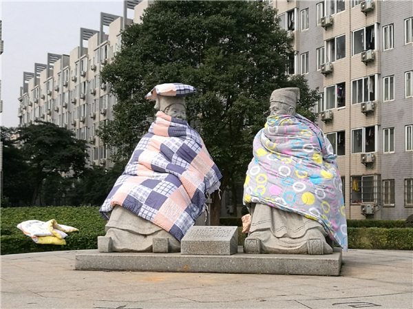 慘遭蓋被的是“朱張會講”的朱熹和張栻雕像,位於湖南大學德智園學生公寓樓前。