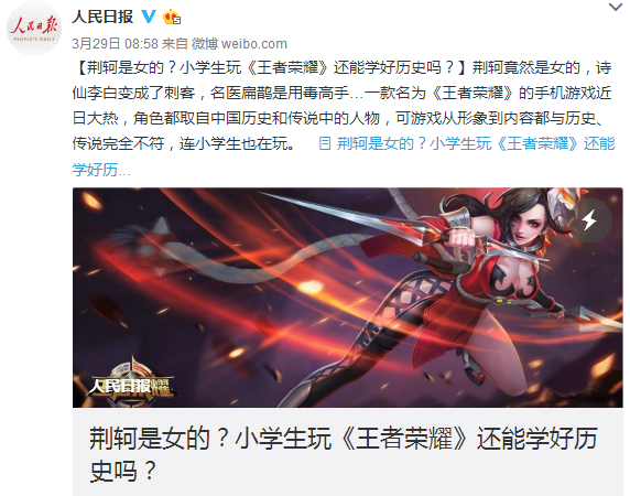 《光明日報》最近發了篇文章《手機遊戲不能顛覆歷史》,批評騰訊的手遊《王者榮耀》,遊戲裏荊軻是女的,李白成刺客,讓家長憂心忡忡,覺得小學生玩了這樣的遊戲會學不好歷史。《王者榮耀》一半以上的用户是11歲到20歲。