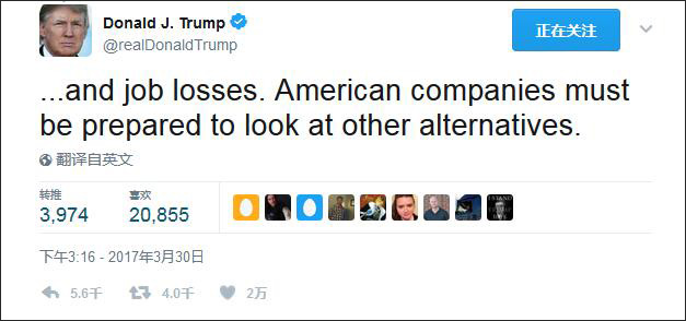 當地時間30日下午3點多,特朗普連續發表兩條推特稱,“下週與中方的會晤將非常困難,我們不能再承受龐大的貿易赤字……以及損失工作機會。美國公司必須準備好考慮其他替代選項”。