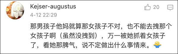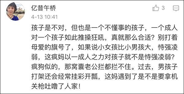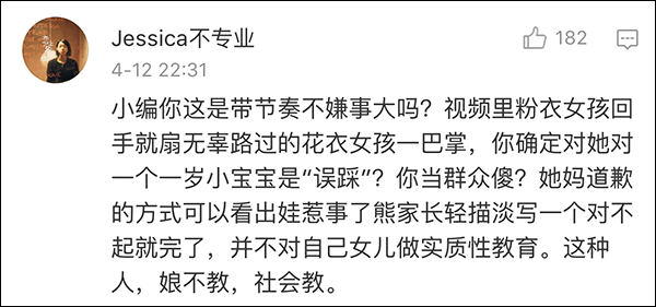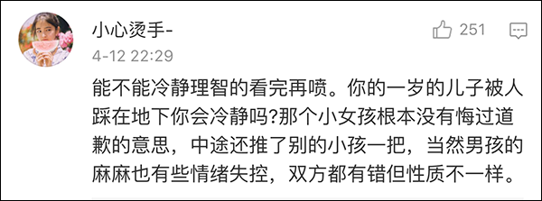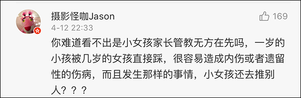 而另一方,則找出視頻中,小女孩推搡另一圍觀小女孩的細節,認為女孩欠管教,是個熊孩子。