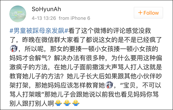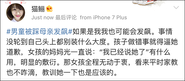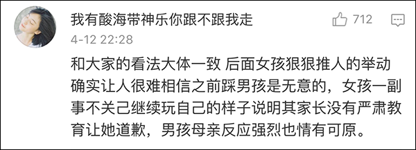 有支持男童母親的網友稱,從視頻裏看,小女孩根本沒有悔過和道歉的意思。更直言,任何一個母親遇到這樣的事情都不會冷靜,“娘不教,社會教。”