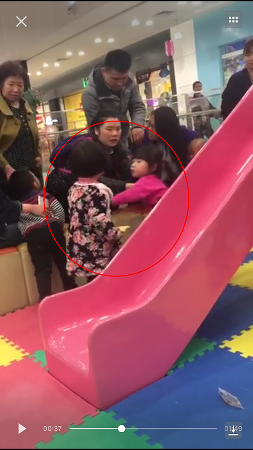 視頻顯示,在疑似某商場兒童遊樂區內,身穿玫紅色上衣的女童對一名一歲左右男童做出了不當舉動(具體行為尚不明確,據男童母親稱是女孩從男童身上踩過去)。