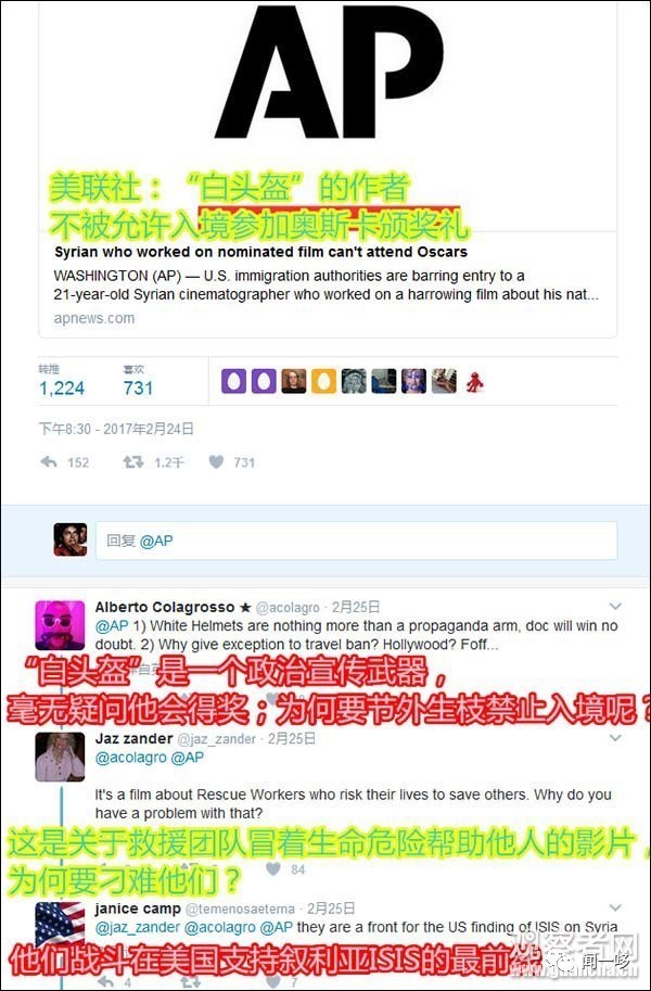 甚至,連短片《白頭盔》拍攝者之一、“白頭盔”負責人雷德·薩利赫還因為有與敍利亞“基地組織”、“努斯拉陣線”等恐怖組織聯繫的嫌疑,未被美國獲准入境。