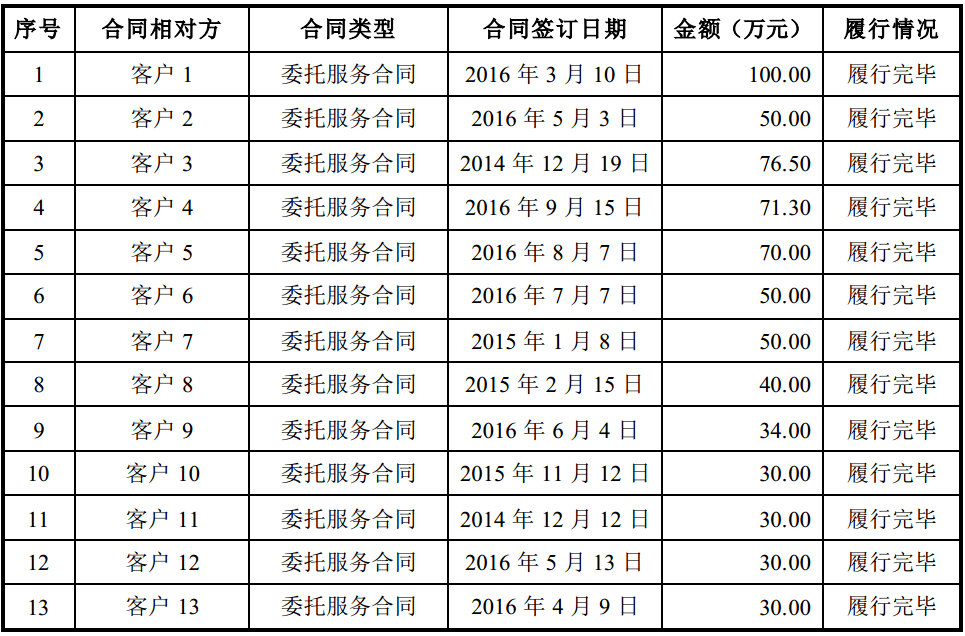另外在其重大銷售合同中,序號為“4”的客户(合同簽訂日為2016年9月15日),已履行完畢的合同金額為71.30萬元,按道理這應該也在2016年前十個月的前五大客户名單之中才對,但實際上,當期並沒有相同金額的大客户,即便是其第二大客户的銷售金額也只有67.31萬元,那麼這位合同客户又是誰?
