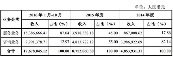 但是同時值得注意的是,公司的“諮詢類”業務沒什麼起色。但是服務類業務收入從86萬上升到了1500萬,至於是什麼樣的業務就不得而知了。