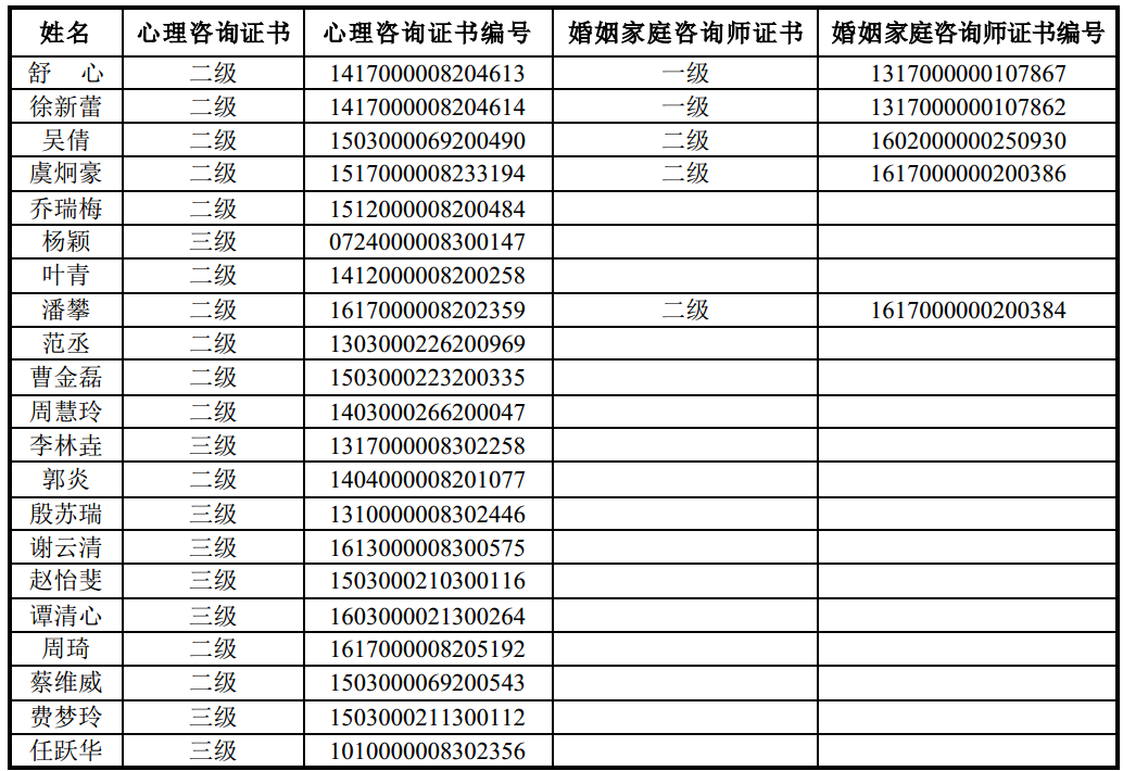 而且,其下屬員工的業務資格也有問題,在其披露的公開轉讓説明書中也表示:業務人員以具有婚姻家庭諮詢師、心理諮詢師資質的專業人才為主。其部分核心人員既沒有心理諮詢證書,也沒有婚姻家庭諮詢師證書,比如核心員“瑜峯”卻沒有出現在名單之中。