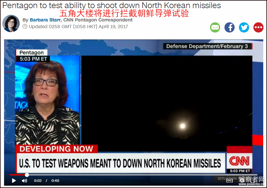【觀察者網 綜合報道】據美國有線電視新聞網(CNN)19日報道,美軍將於五月份進行2次攔截朝鮮導彈試驗。